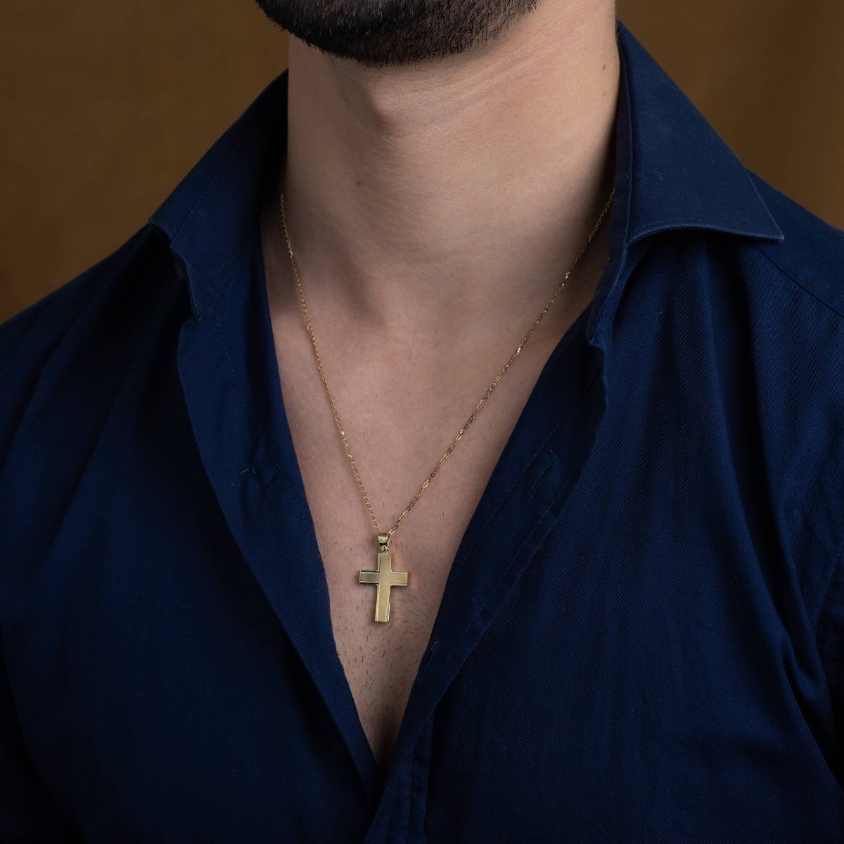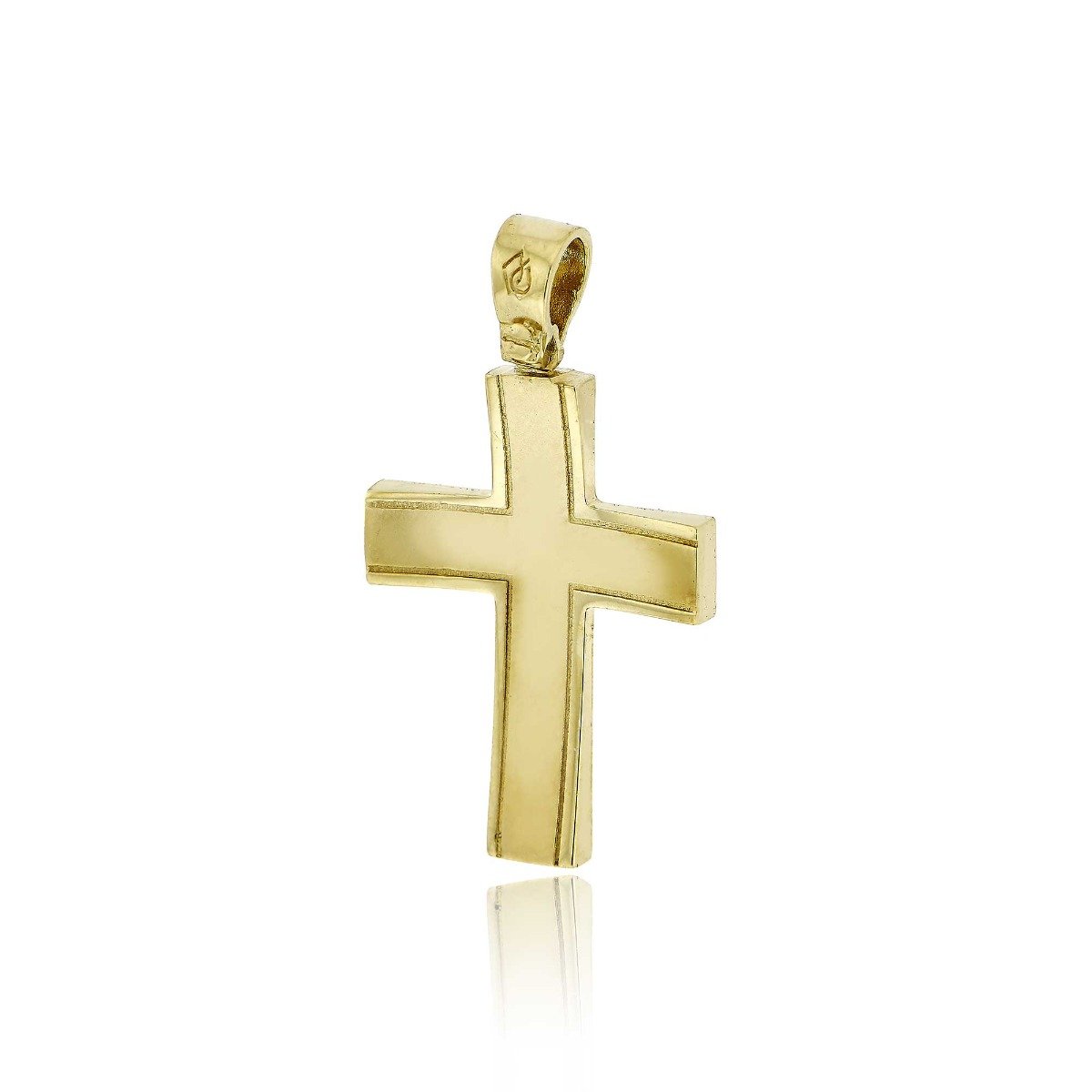 Απλός και κλασσικός σταυρός για αγόρι ή άντρα, με κοιλότητα. Είναι φτιαγμένος από κίτρινο χρυσό 14 καρατίων και έχει διπλό φινίρισμα.