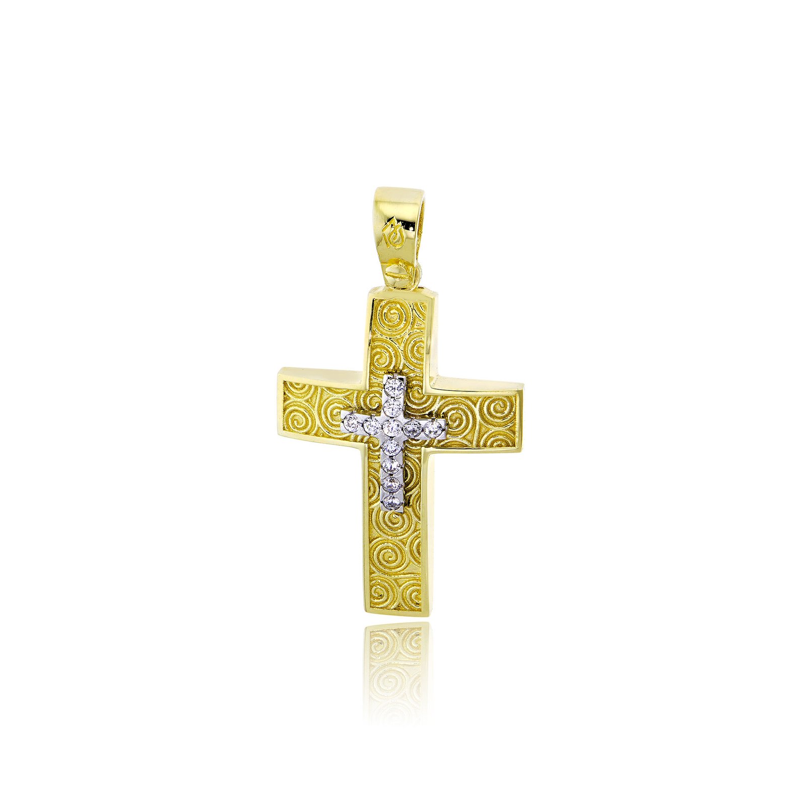 Εντυπωσιακός σταυρός βάπτισης από κίτρινο και λευκό χρυσό 14 καρατίων, διακοσμημένος με λαμπερά ζιργκόν. Η περίτεχνη σκαλιστή υφή προσθέτει μία μοναδική πινελιά κομψότητας, κάνοντάς τον ιδανική επιλογή για μια ξεχωριστή περίσταση.