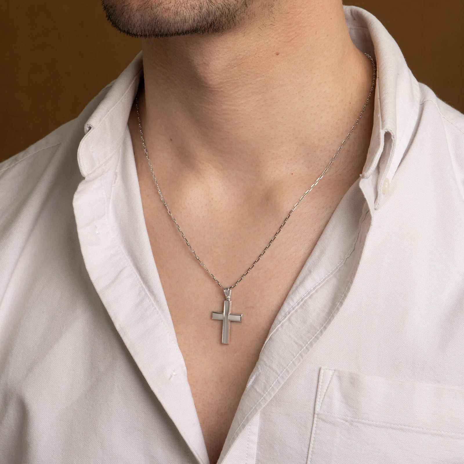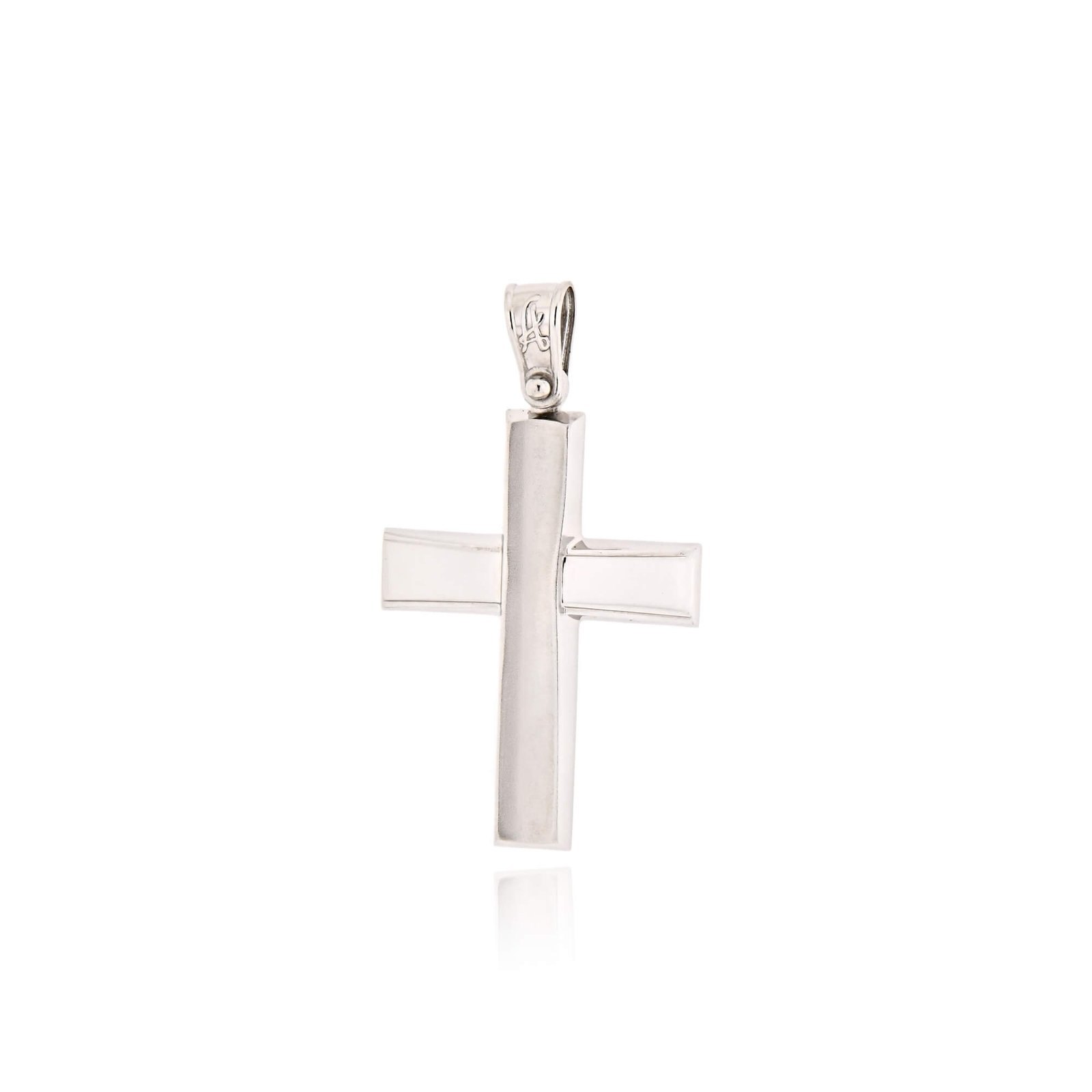 Σταυρός Βάπτισης Σκέτος από Λευκό Χρυσό 14 Καρατίων. Ένα κομψό σχέδιο που συνδυάζει δύο διαφορετικές υφές φινιρίσματος, προσδίδοντας μια διακριτική αλλά εντυπωσιακή εμφάνιση. Ιδανικός για μια ξεχωριστή περίσταση.