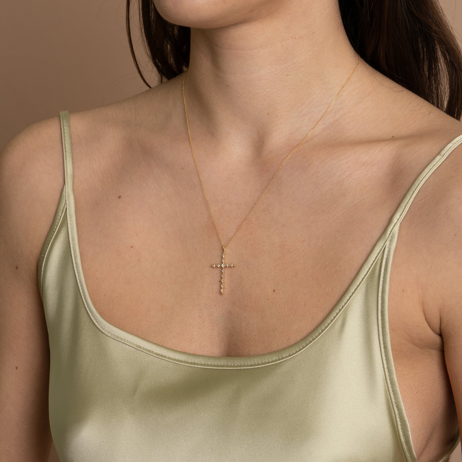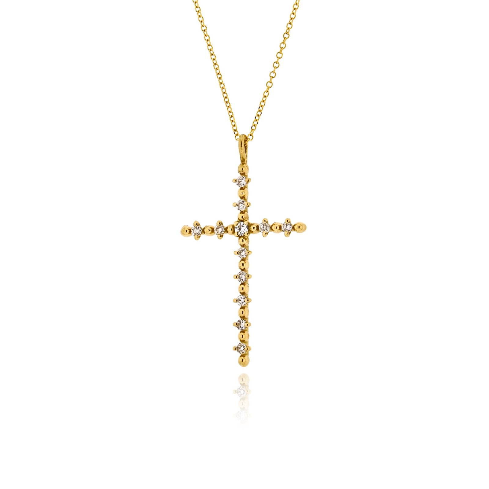 Βαπτιστικός σταυρός με πολύ ιδιαίτερες λεπτομέρειες, φτιαγμένος από κίτρινο χρυσό 18 καρατίων. Το περίτεχνο σχέδιο είναι διακοσμημένο με λευκά διαμάντια. Η χρυσή αλυσίδα περιλαμβάνεται.