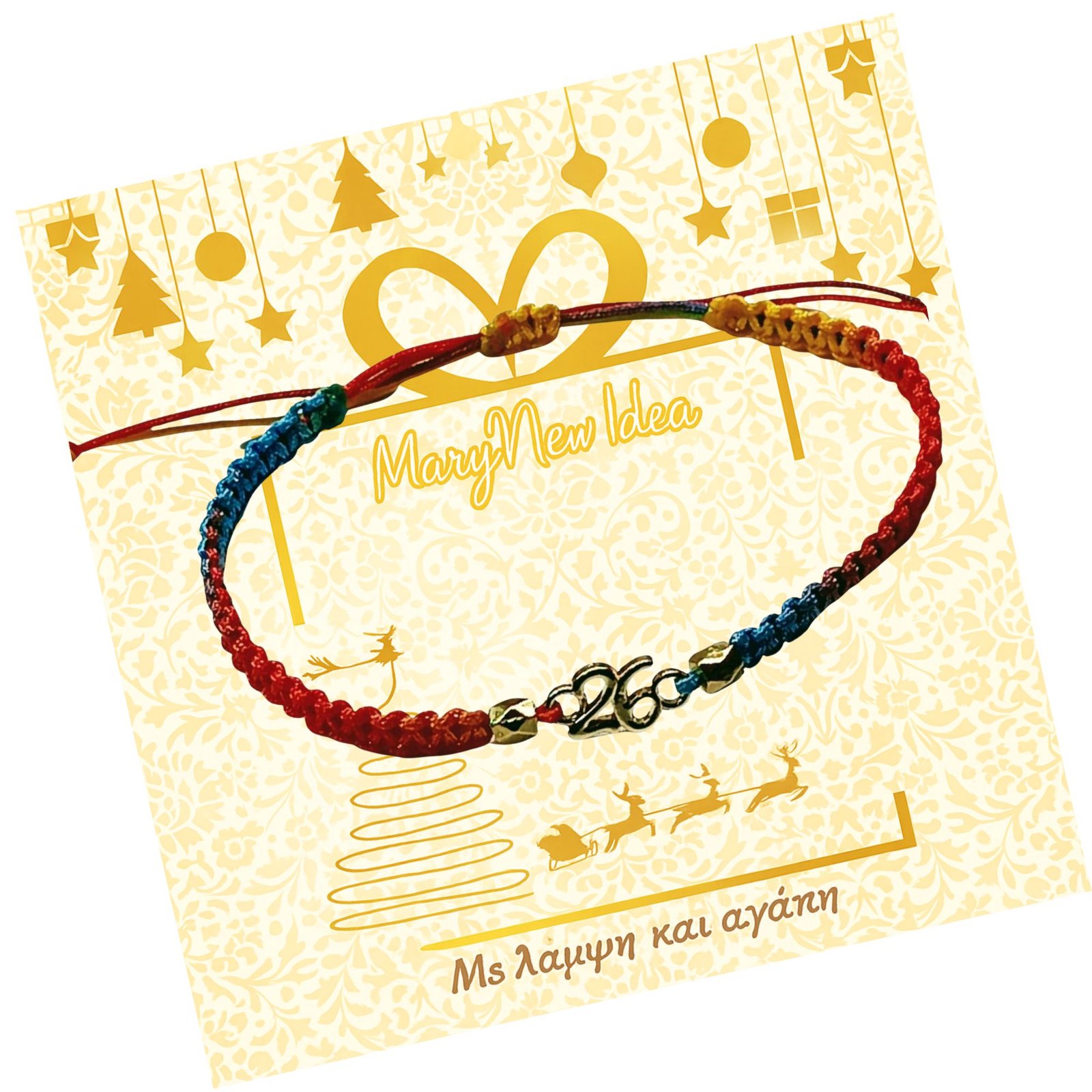 Βραχιολάκι-γούρι πλεγμένο με νήμα ντεγκραντέ στα χρώματα κίτρινο, πορτοκαλί, γαλάζιο, μπλε, με κεντρικό στοιχείο το μεταλλικό “26” και μεταλλικές πολυγωνικές χάντρες να το πλαισιώνουν.