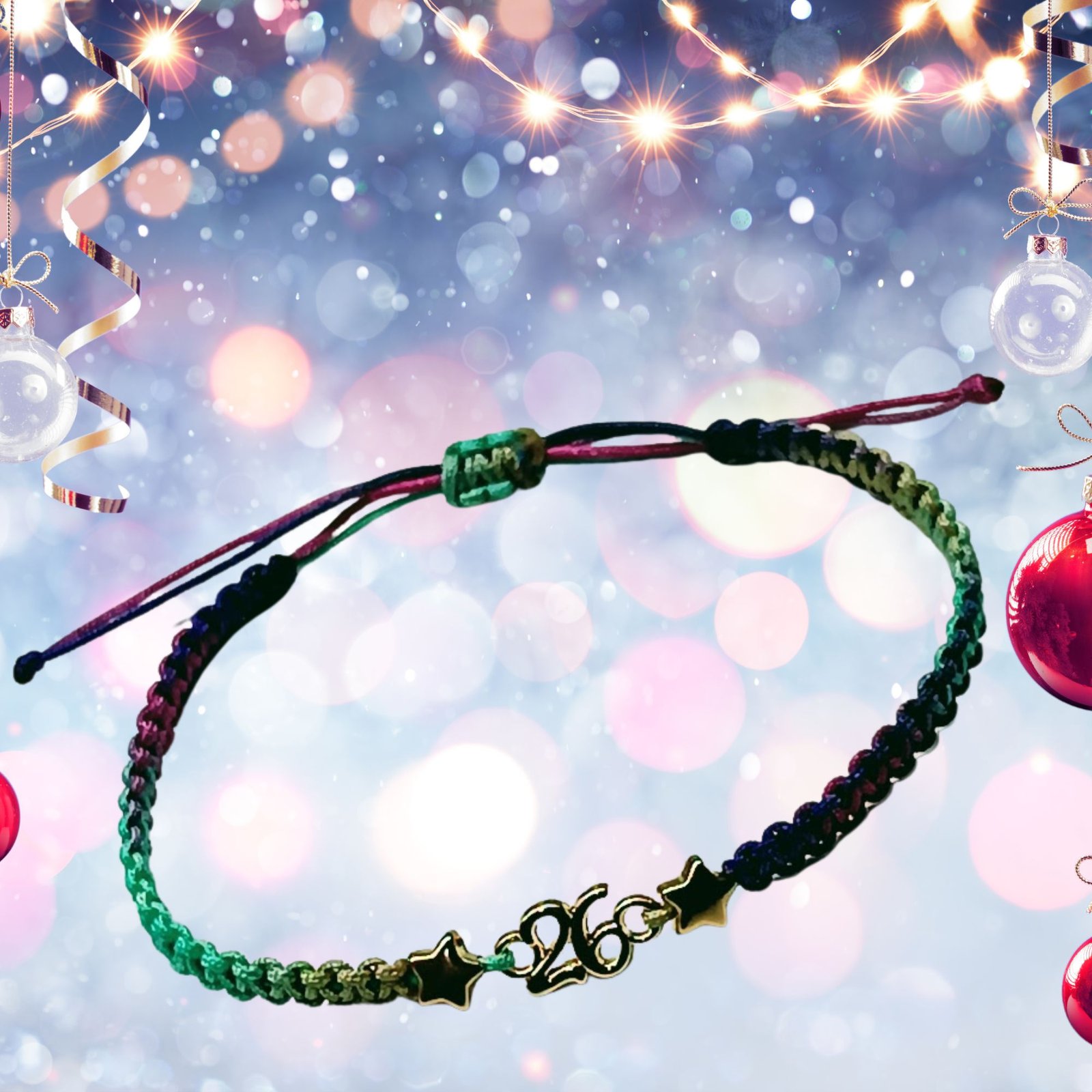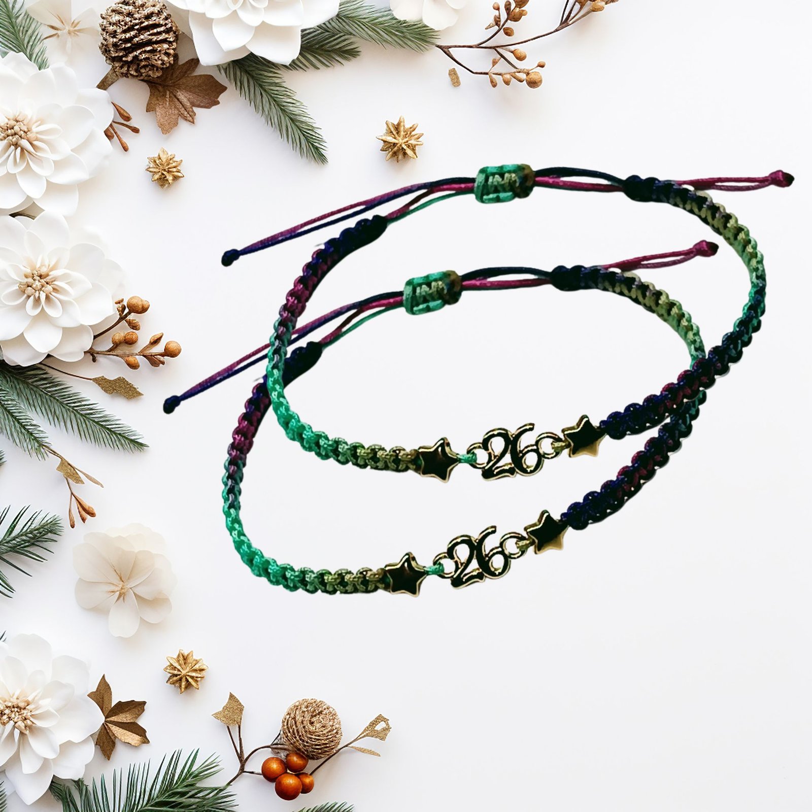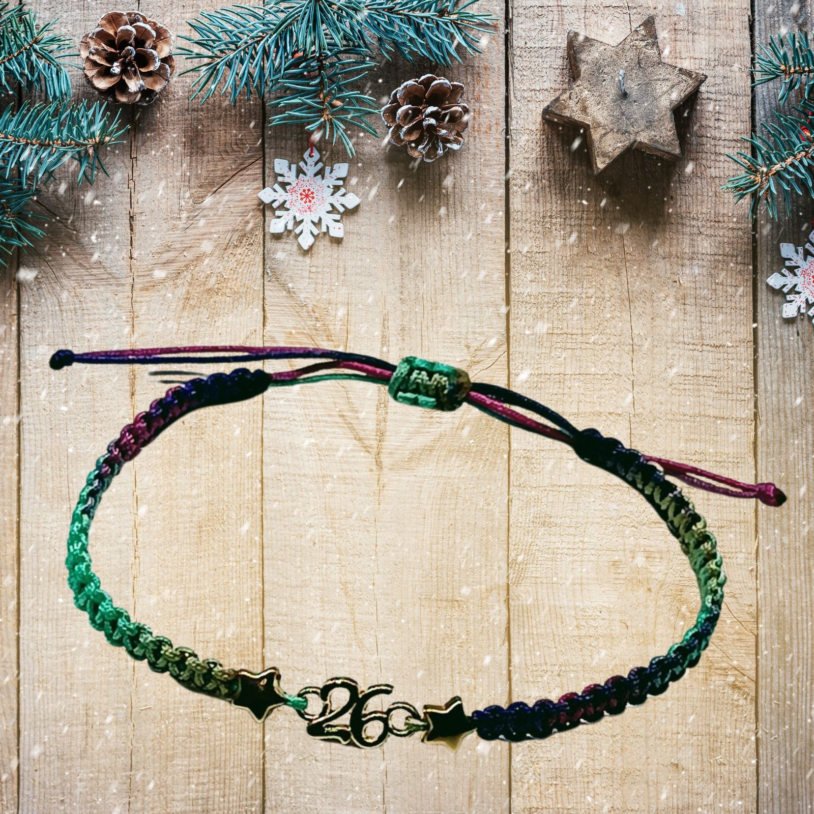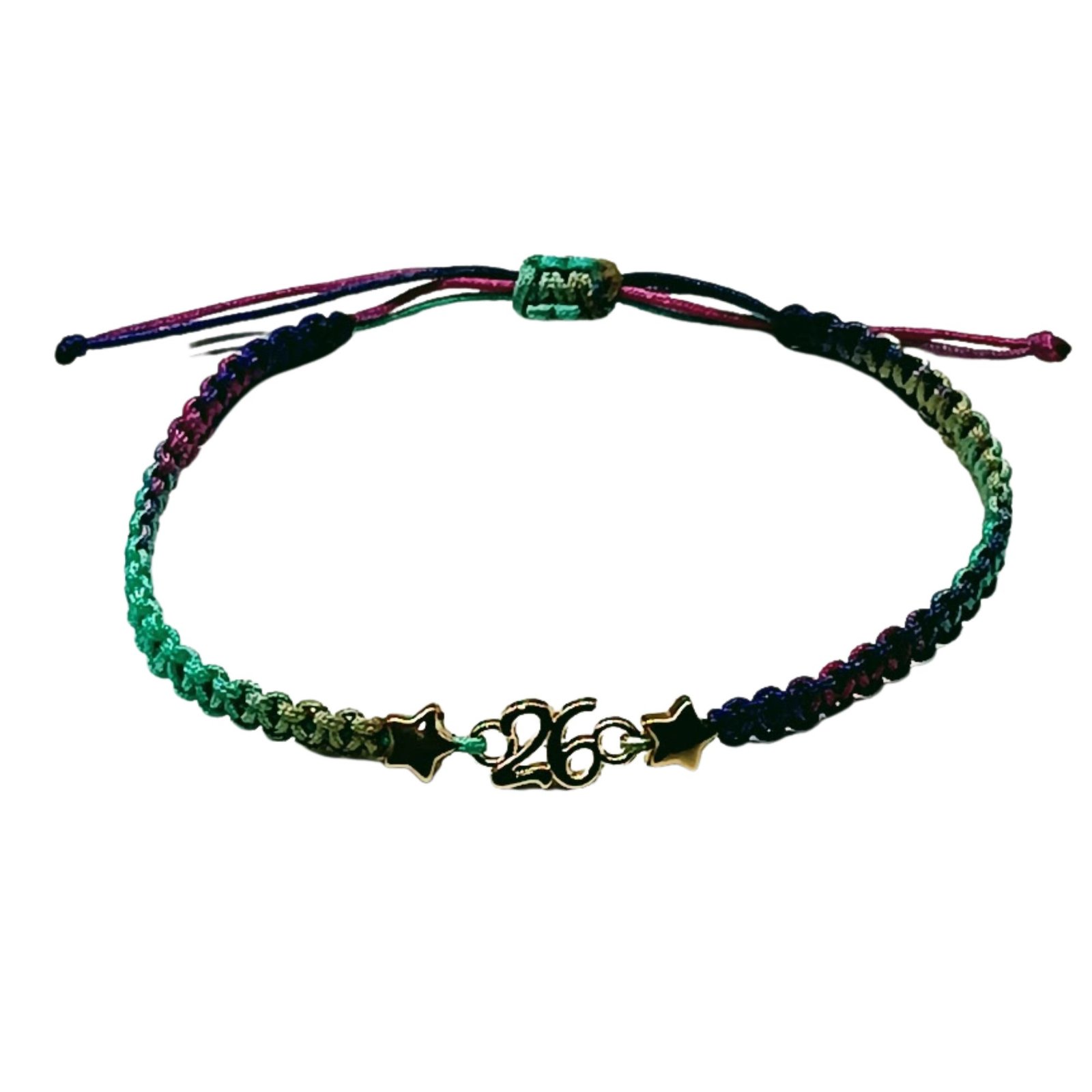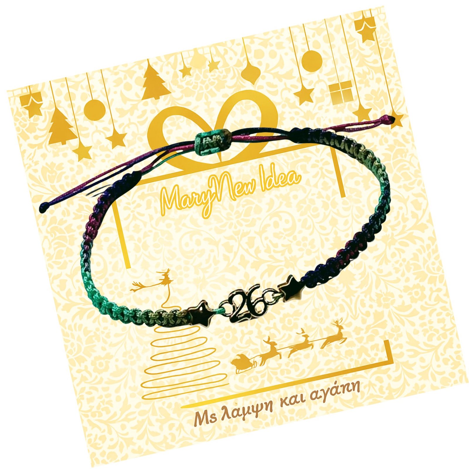 Βραχιολάκι-γούρι πλεγμένο με νήμα ντεγκραντέ στα χρώματα πράσινο της μέντας, χακί, αποχρώσεις του μωβ, με κεντρικό στοιχείο το μεταλλικό “26” και μεταλλικά αστεράκια να το πλαισιώνουν.