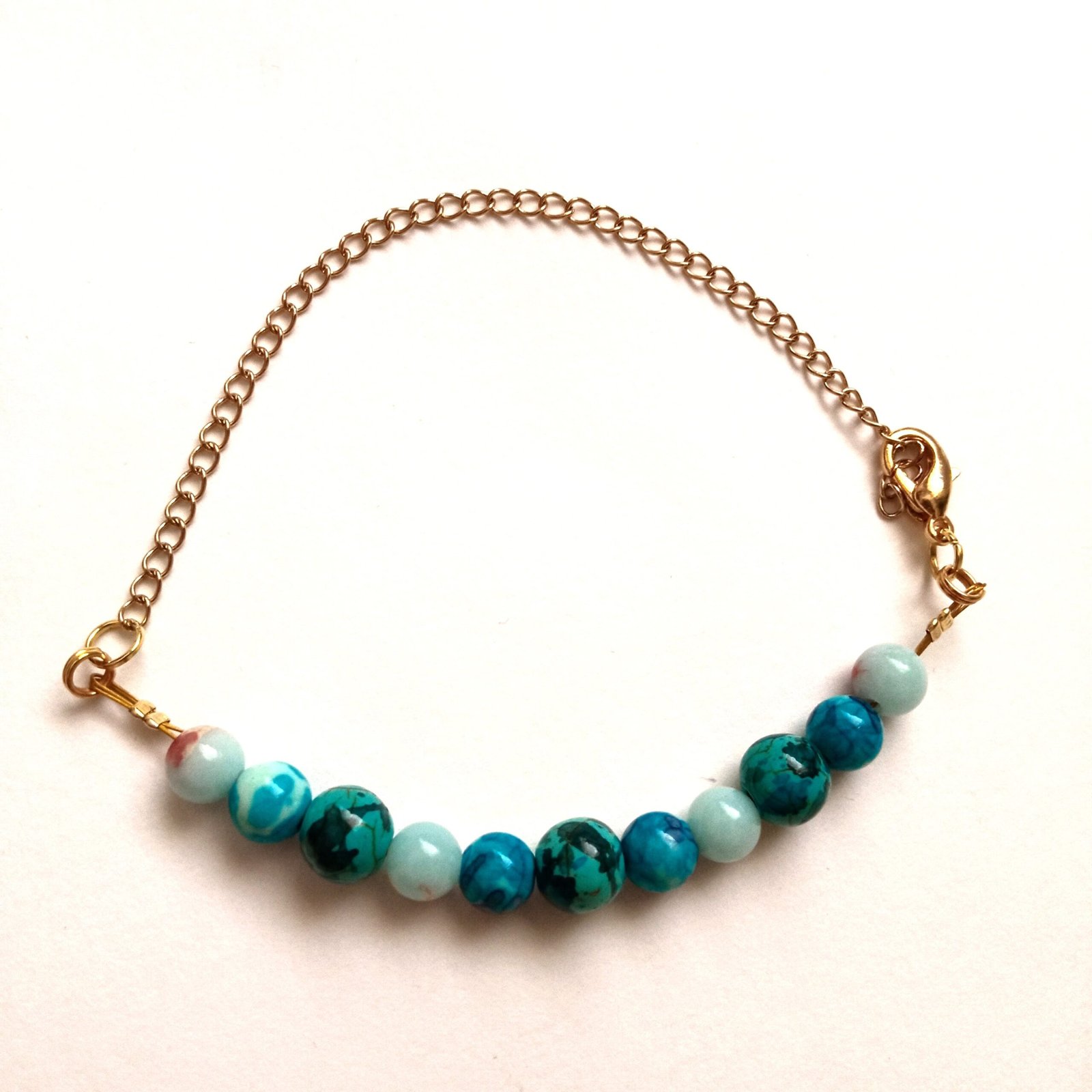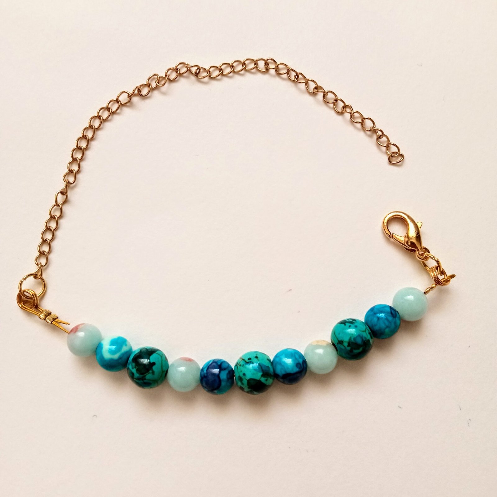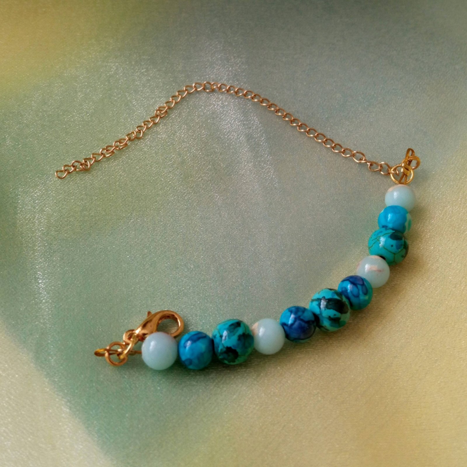 Xειροποίητο βραχιόλι με ατσάλινη αλυσίδα σε χρυσαφί χρώμα, διακοσμημένο με ημιπολύτιμες πέτρες χαολίτη σε αποχρώσεις του μπλε και γαλάζιου, καθώς και ίασπη σε ανοιχτό γαλάζιο τόνο.