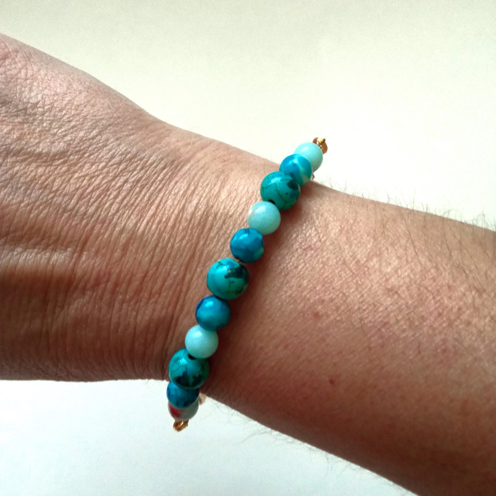 Εντυπωσιακό βραχιόλι με ατσάλινη αλυσίδα σε χρυσαφί χρώμα, ημιπολύτιμες πέτρες χαολίτη σε αποχρώσεις του μπλε-γαλάζιου με εντυπωσιακά “νερά” και ίασπη σε ανοιχτό γαλάζιο, δεμένα με ατσαλόσυρμα.